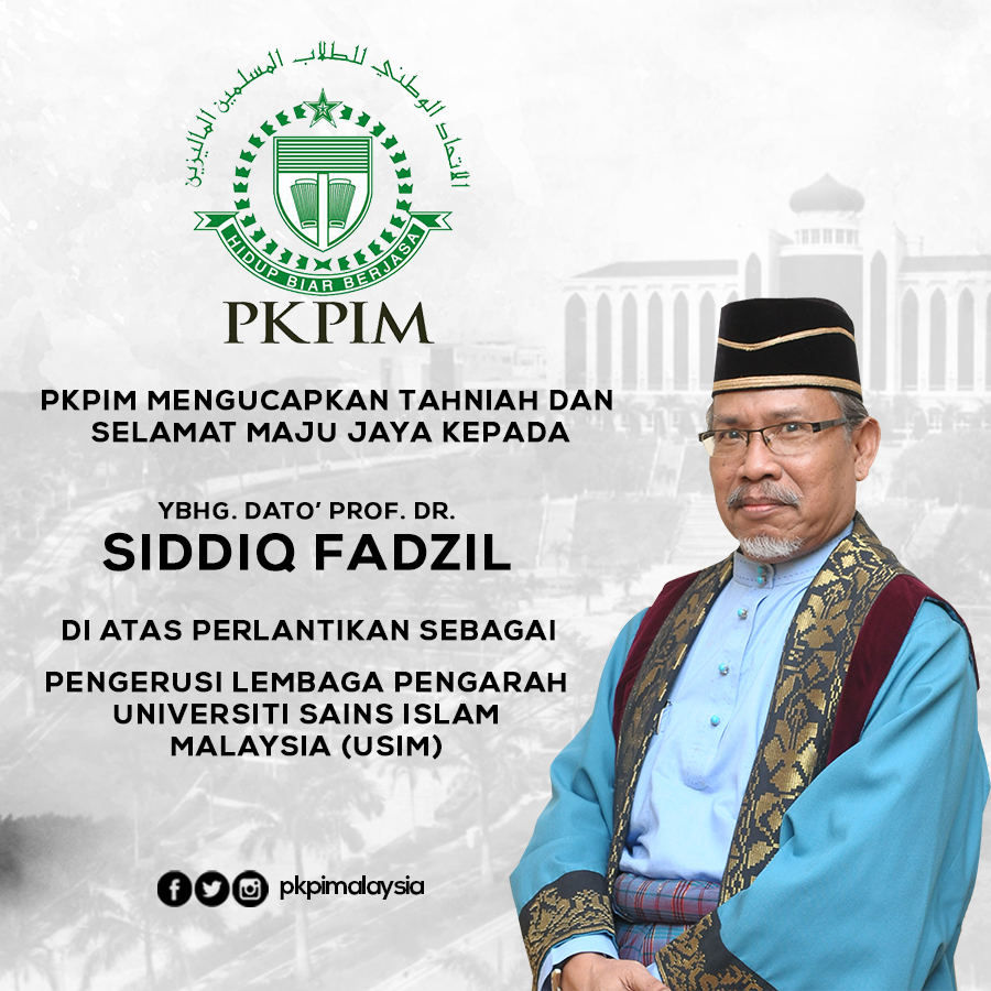 Persatuan Kebangsaan Pelajar Islam Malaysia (PKPIM) mengucapkan tahniah di atas perlantikan YBhg. Prof. Dato’ Dr. Siddiq bin Fadzil sebagai Pengerusi Lembaga Pengarah Universiti Sains Islam Malaysia (USIM) bermula daripada 1hb Oktober 2018 sehingga 30 September 2021.